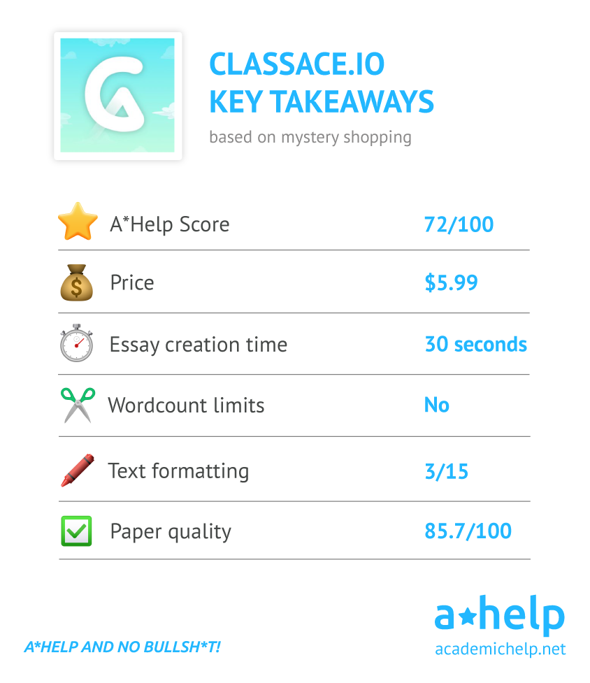 Classace.io is a platform that gathers different tools that allow students to handle their assignments with quality and ease. We checked out their platform and even created an essay that got graded at 85.7/100 pts. We used the service for free and liked the seamless user experience. Classace did however miss a variety of extra features. Still, when it comes to the best AI essay writer free of cost, Classace’s paper quality stands out.