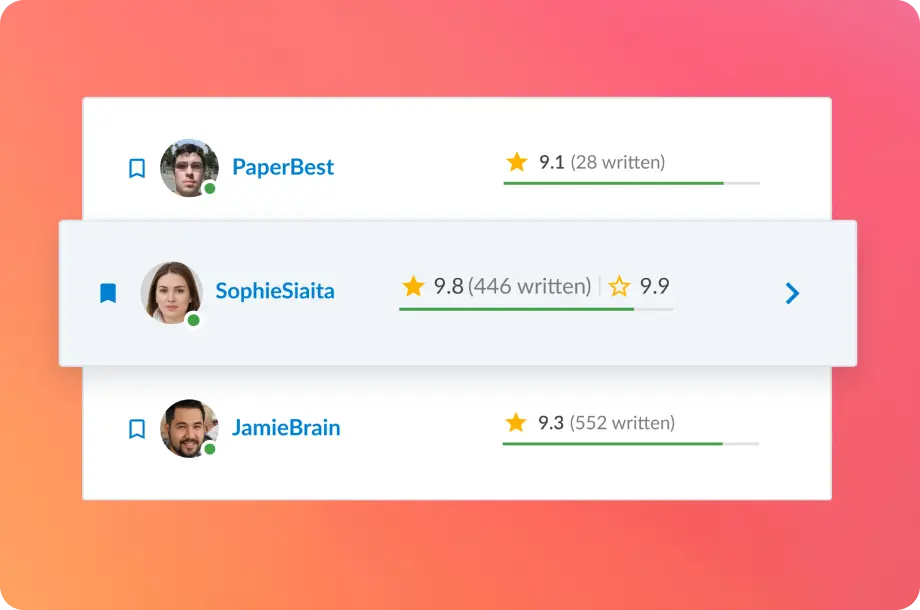| Bidding system Browse writers’ profiles, read reviews, and assess samples to choose the best expert to work on your project. | Experienced writers Every candidate has to pass a rigorous testing process to prove their expertise before getting hired. | Confidentiality and security With our reputable data protection system, your personal information is always confidential. |
