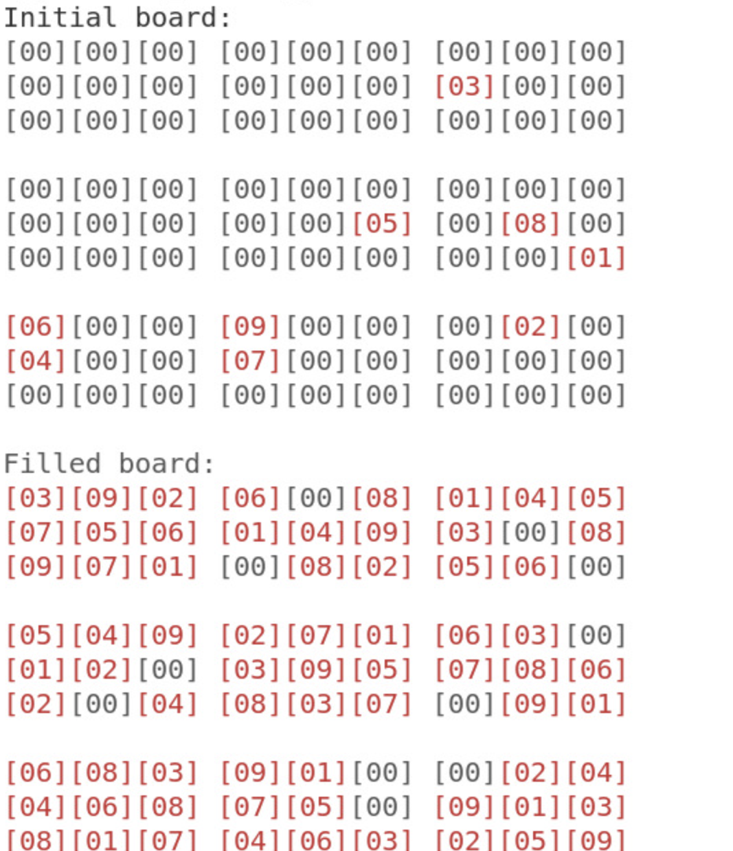 - There is some missing printout as compared to the sample output given by the guideline. The final puzzles should be printed out in both Python dictionary format and board format as shown in the example output.