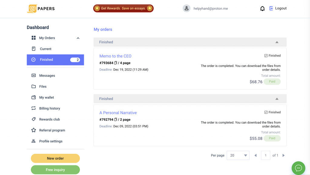 99Papers functions great in the pricing department as well. We paid $55.08 for the essay and $63.26 for the memo. This indicates that the company reasonably charges clients. Along with the fair price, customers should take advantage of available discounts and the loyalty program. Every shopper gets up to 15% cashback and should remember to claim a 10% discount via chat with the support team. As for the loyalty program, it offers credits as a percentage of the total amount paid for each purchase. The credits are in US dollars, and their amount depends on the reward percentage.