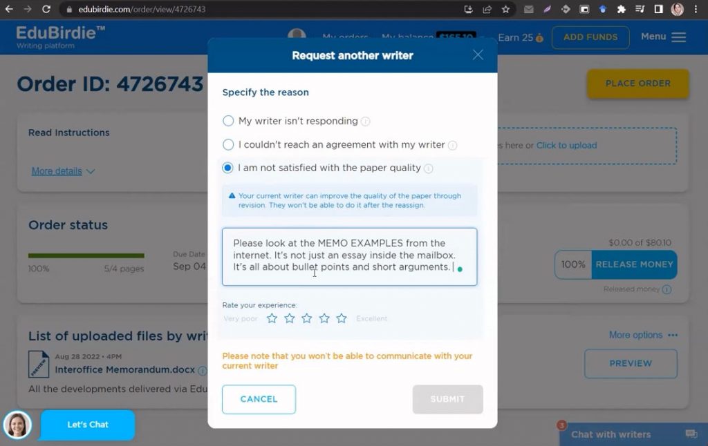 We even tried to change our writer at EduBirdie.com (click to see a large picture)