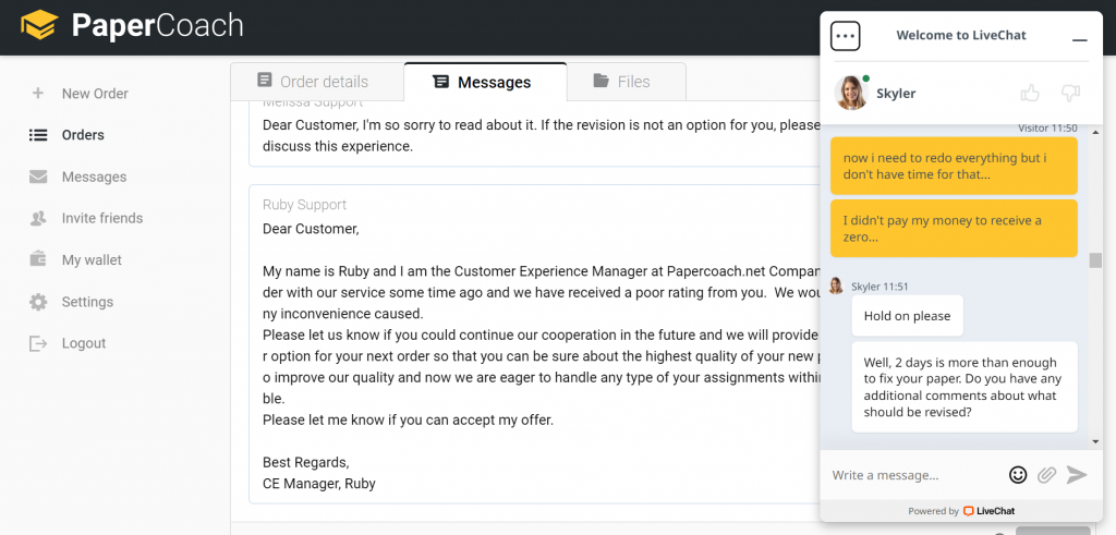 Unfortunately, having sent it out to the professor yet again, the paper still got marked with a “3rd party” shameful label. We connected with the customer experience manager and filed for a refund. According to PaperCoach’s policies, you are not eligible to get your money back after you approve the order. Nevertheless, the manager offered us to deposit a 20% credit from our paid order into the website’s wallet. Now we have $11.40 for future use with the platform.