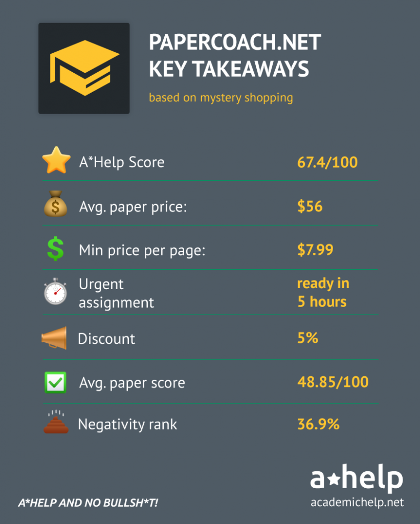 Besides, we also look at the platforms’ value for money and overall experience and evaluate them according to the special A*Help standard. As a result, each service gets a score according to its merits. PaperCoach became one of the participants in this evaluation and so also landed in our ranking.
