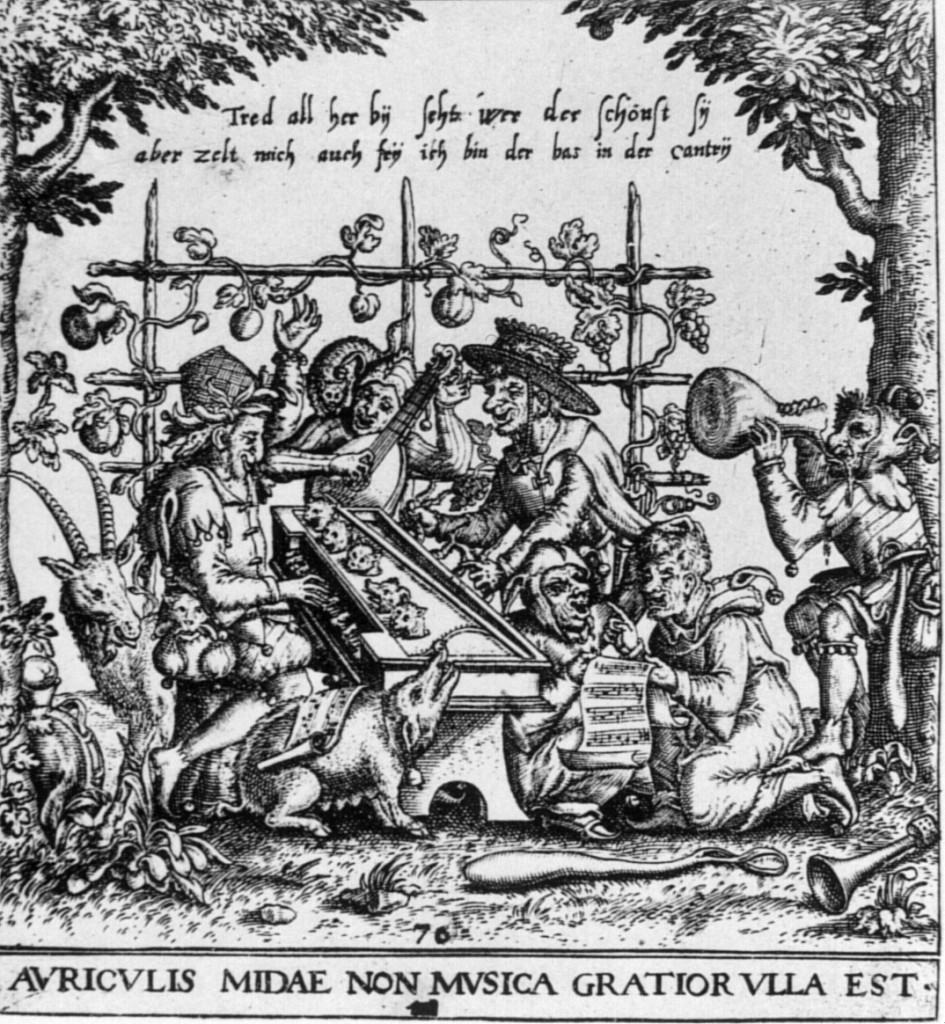 Similarly hovering between the speculative and empirical is the curious device known as the cat piano. The earliest known image of a set of cats arrayed as sound-producing elements to be activated by the fingers dates to the late sixteenth century, that is, over a hundred years before the invention of the piano, at a time when it would more properly be called a cat harpsichord or clavichord. The image comes from an emblem book, Johann Theodor de Bry’s Emblemata saecularia mira et iucunda uarietate saeculi huius mores ita exprimentia ut sodalitatum symbolis… (1596), and shows a motley ensemble of animals and confused musicians. A subtitle to the scene, “there is no music sweeter to Midas’s ears,” alludes to the Phrygian King whose punishment for preferring Pan’s pipe to Apollo’s lyre was to have his ears turned into those of a donkey.